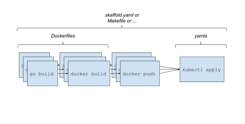 Tools such as skaffold can wrap this process for arbitrary languages and Dockerfiles to make it easier to manage (and faster), but you still need to write artisanal hand-crafted Dockerfiles , and typically need to write more yaml (or other) to tell the tooling how to orchestrate this (e.g. what gets pushed where?):